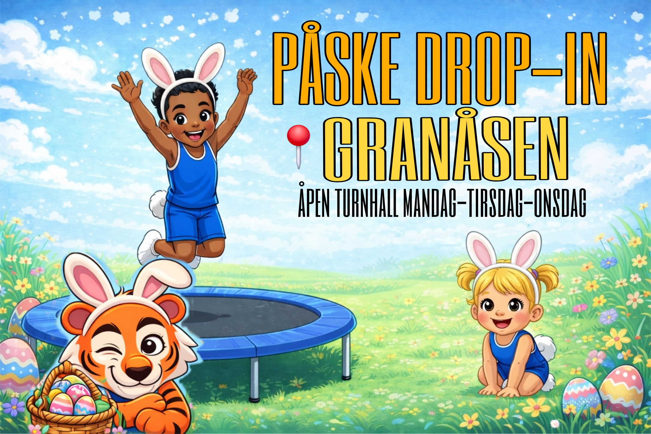 Mandag, tirsdag og onsdag i påsken arrangerer vi drop-in for hele familien i vår turnhall i Granåsen, Smistadveien 9-11. Om du ikke er på hytta eller annen ferie er du velkommen til å leke med familie eller venner i turnhallen. Vi har utstyr tilpasset både store og små blant annet flere trampoliner, helt ny skumgrop, ringer, svingstang og skranker.